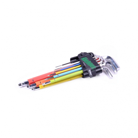 - Jeu de 9 clés hexagonales/6 pans longues à boule avec des tailles : 1,5, 2, 2,5, 3, 4, 5, 6, 8 et 10 mm.